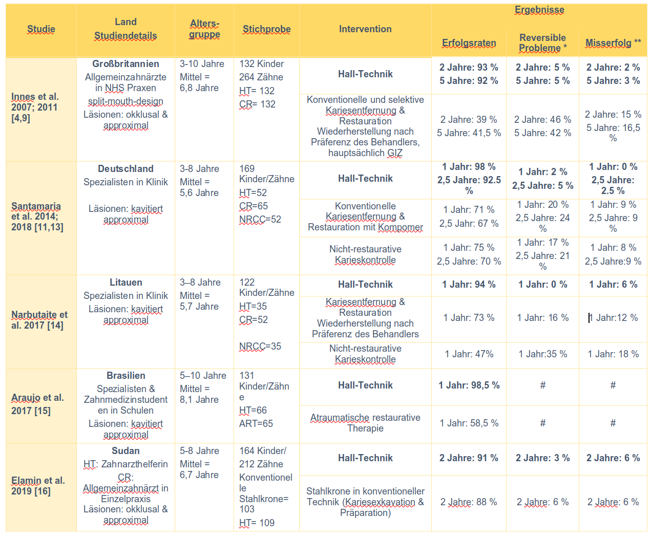 Tabelle 2: Erfolgsrate zur Hall-Technik an Milchmolaren und ihren Vergleichsinterventionen in fünf bislang publizierten randomisierten klinischen Kontrollstudien